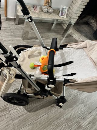 Vendo cochecito Bugaboo en color beige edicion especial. Está en buen estado y se incluye el capazo y la silla. También se incluye un plástico para la lluvia y el saco de invierno. Como veis en las fotos por dentro es acolchado, textiles impecables. Deteriorado la espuma del manillar y algunos arañazos que se ven en las fotos. Ademas incluye: -colchoneta rosa de verano -capota rosa -saco invierno rosa -sombrilla rosa -silleta en gris -textil capazo gris -cesta de compra negra