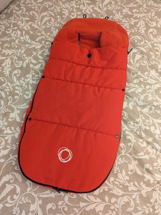 Saco para cochecito de bebé, ideal para mantener al pequeño abrigado. - Saco rojo con cremallera. - Saco negro con logo Bugaboo. - Saco negro con etiqueta TEDDY.