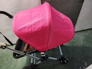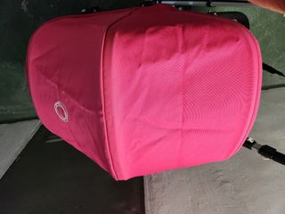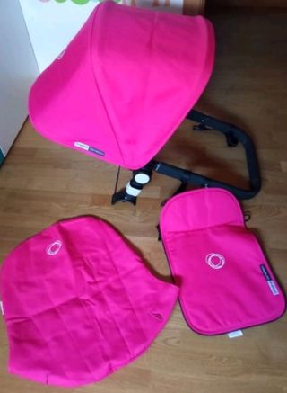 Capota y saco bugaboo cameleon. Color fucsia. La capota está un poco descolorida, por el sol, en la zona de las varillas, pero se aprecia poco. Se ve en las fotos. El saco esta bien. También se incluye funda de verano en color fucsia, tiene un desperfecto que cuando está la silla montada casi no se aprecia, en un lateral, mirar foto.
