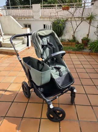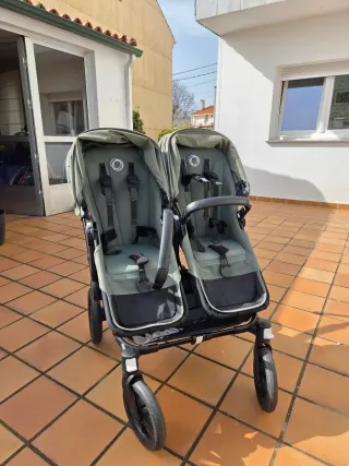 Versátil carrito Bugaboo Donkey 5, adaptable para gemelos o hermanos seguidos. También para un solo niñ@ poniendole el bolsito y encogiendolo. En la foto no se ven pero también van los 2 capazos para bebes recién.Aún le quedan 2 años de garantía. Regalo sacos de invierno y plásticos para la lluvia. - Chasis negro. - Capazo y silla en color verde oliva. - Incluye cesta lateral. - Ruedas todoterreno.