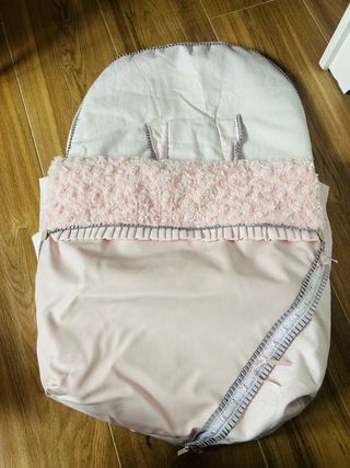 Saco para silla de coche Grupo 0. - Color rosa y blanco. - Tejido suave y confortable. - Cierre con cremallera. Nuevo a estrenar.