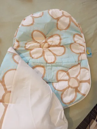 Funda/ Saco de invierno con un bonito estampado floral en tonos azules y beige. Es acolchado y suave. Nuevo con etiqueta. - Apta para silla de coche Grupo 0 o capazo. - Diseño con flores grandes blancas y detalles en beige. - Fondo azul claro con pequeños puntos. - Cremallera lateral para facilitar el acceso.