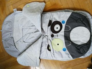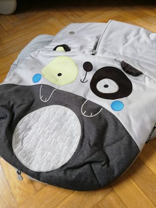 Saco para silla de paseo, ideal para invierno. Está en muy buen estado, apenas usado. - Diseño de estrellas en tonos oscuros. - Incluye capucha con diseño de panda. - Tejido acolchado y suave.