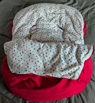 Saco de invierno para silla de coche de la marca Tuc Tuc. Está en muy buen estado y es perfecto para mantener a tu bebé calentito durante los paseos. - Diseño de koala. - Color rojo. - Interior de borreguito beige.
