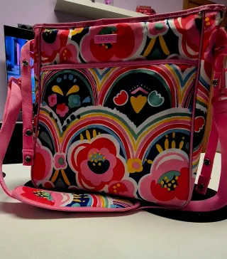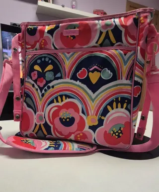 Bolso de la marca Tuc Tuc con un alegre estampado floral y de arcoíris. - Diseño colorido. - Cierre de botón a presión. - Correa ajustable para el hombro. DISPONGO TAMBIEN DE SACO DE INVIERNO A JUEGO CON LA BOLSA