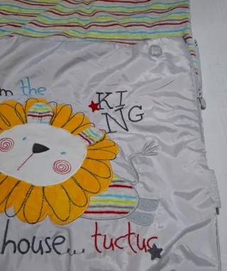 Saco de invierno para silla de paseo de la marca Tuc Tuc. Está en muy buen estado y es ideal para abrigar a tu bebé durante los meses más fríos. - Diseño con estampado de conejitos y abejas. - Capucha extraíble. - Cremallera frontal para facilitar su uso. - Tejido suave y cálido.