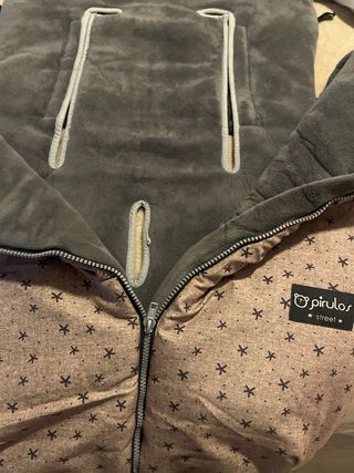 Saco de invierno para silla de paseo, ideal para mantener al bebé abrigado en los días fríos. - Exterior en color gris y negro. - Interior acolchado con forro polar - está un poco sucio, hay que lavarlo