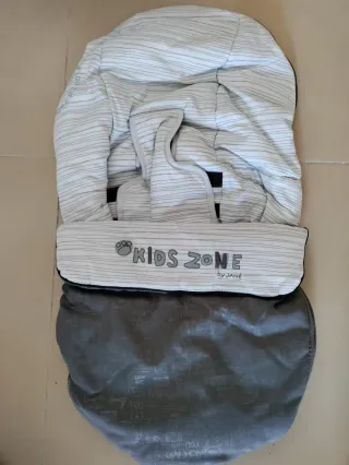 Saco de invierno de la marca Jané, modelo Kids Zone. Ideal para mantener al bebé abrigado. Usado en Jané Matrix Rider. - Diseño a rayas blancas y grises. - Incluye funda de transporte. - Acolchado interior.