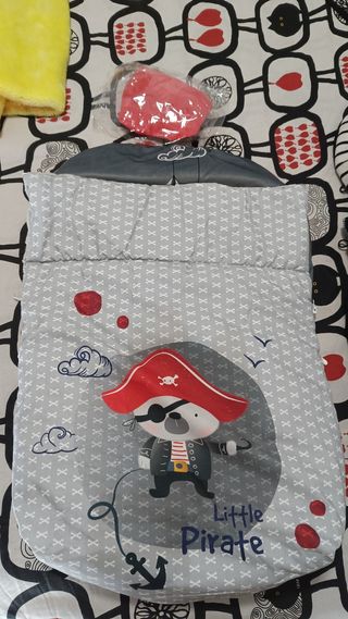 Saco de invierno para silla de coche maxicosi, en perfecto estado. Incluye un cubre-cabeza a juego. - Diseño de pirata. - Color gris y rojo. - Tejido suave y cálido. - Ideal para mantener a tu bebé abrigado durante los paseos en coche. Como Nuevo.