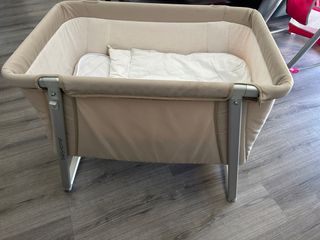 Cuna para bebé hasta 1 año, se giran la base de las patas y se puede poner en modo fijo o para poder mecer la cuna. Se adjunta colchón visco y funda hipoalergénica y alguna sábana y saco. Se desmonta y se puede llevar en una bolsa grande de 50x80x20 Ha sido usada en 2 niños. El colchón y la funda lo cambiamos en el segundo.
