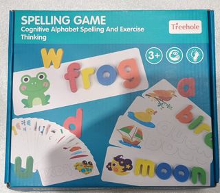Set de 7 juegos iguales, educativos Spelling Game de Treehole para aprender inglés. Incluye letras de madera y tarjetas. - Juego de deletreo y pensamiento cognitivo. - Diseñado para niños a partir de 3 años. - Incluye letras de madera con formas de animales y objetos. - Tarjetas con imágenes y palabras para deletrear. En el conjunto también hay 9 bolsas o sacos para regalos de navidad con motivos navideños y 3 bandejas con pinturas para juegos infantiles. Ideal para reglaos de navidad, colegios, amigo invisible, caga tió. etcc....