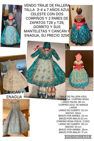 VENDO TRAJE DE FALLERA AZUL TURQUESA- CORPIÑO ROSA, TIENE TELA PARA IR SACANDO SEGUN VAYA NECESITANDO LA NENA. LARGO FALDA: 60 cm CORPIÑO AZUL DE MANGA LARGA LARGO DE CUERPO: 32 cm ANCHO: 30cm BRAZO POR ARRIBA: 32 cm BRAZO POR ABAJO:23 cm CORPIÑO ROSA POR EL CODO. LARGO DE CUERPO: 40 cm ANCHO: 33 cm BRAZO POR ARRIBA: 25cm BRAZO POR ABAJO: 17 cm