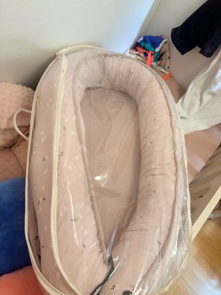 Nido para bebé con un bonito estampado de árboles y pájaros. - Color rosa pálido. - Incluye funda de plástico con cremallera.