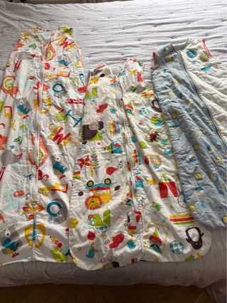 Conjunto de 3 sacos de dormir para niños de la marca Grobag (2 sacos de 95 cm uno mas abrigado y otro con tela mas fina y un saco de 120 cm). En perfecto estado. Presentan divertidos y coloridos estampados. - Diseño con letras y personajes. - Estampado de animales y vehículos. - Diseño de estrellas y planetas.