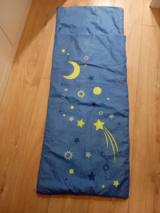 Saco de dormir para niños con un divertido diseño de estrellas y luna. - Color azul. - Estampado nocturno. - Ideal para el verano. Sólo usado en una ocasión.