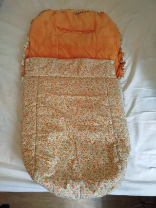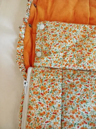Saco de invierno universal para carro de paseo muy gordito y calentito. - Diseño con flores naranjas y rojas. - Cierre de cremallera blanca. - Detalle de volantes. - Cierre con botones a presión. Lo guardé por si volvía a tener una niña, pero no fue así, fue niño.