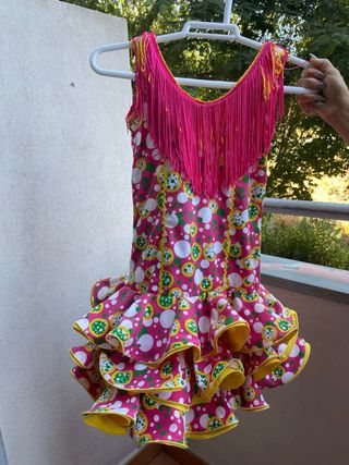 Traje de flamenca para niña hecho a medida talla 6-8. Tiene para sacarle y está usado pocas veces. - Diseño con volantes en la falda. - Adornado con flecos en el escote. - Colores vibrantes: fucsia, blanco, verde y amarillo.