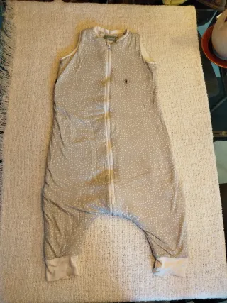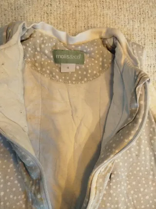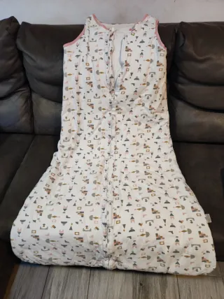Saco de dormir para bebé con un bonito estampado de puntos blancos sobre fondo gris. Ideal para mantener al bebé abrigado y seguro durante la noche. - Diseño sin mangas. - Cremallera frontal. - Puños en las piernas. Tiene una mancha negra, de ahí el precio Incluye funda