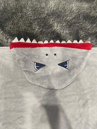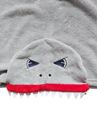 Saco con capucha con diseño de tiburón, ideal para niños. - Color gris con detalles en rojo y azul. - Aletas laterales. - Capucha con dientes y ojos. - Material suave y cálido.