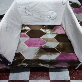 Conjunto de chichonera y saco para cuna de bebé. - Diseño con osito y estrellas. - Tonos pastel y grises. - Tejido suave al tacto.