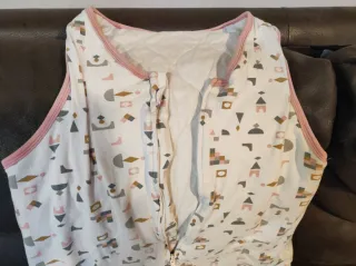 Saco de dormir para niños con un divertido estampado. - Diseño sin mangas. - Cierre de cremallera frontal. - Ribete rosa en cuello y sisas. - Estampado geométrico en tonos pastel y grises.