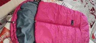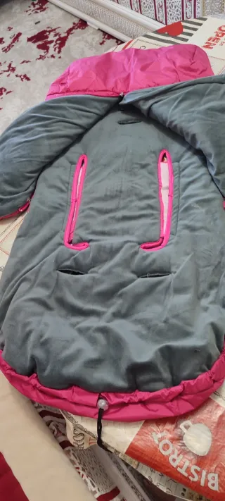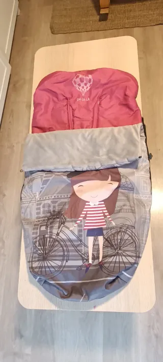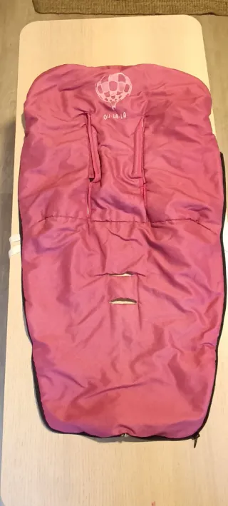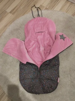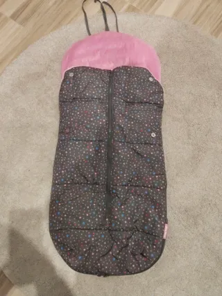 Saco de invierno para carrito de bebé con un diseño muy tierno. - Parte superior en color rosa con un estampado de globo. - Parte inferior con estampado de una niña y una bicicleta. - Forro interior gris suave muy calentito. - Tiene dos cremalleras pero una de ellas no funciona bien, aún y así se puede usar o se puede cambiar la cremallera por lo demás el saco está en perfecto estado. - Tiene amarres extra para que no se mueva en la silla.