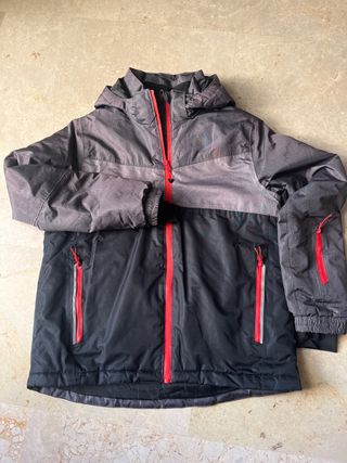 Chaqueta de nieve para niños, talla 10-12 años. Ideal para actividades al aire libre. Calentita porque en su interior lleva forro polar. Mangas con malla para sacar dedo y bolsillos en laterales, en la manga y en el interior. - Diseño bicolor en gris y negro. - Cremallera frontal roja. - Bolsillos laterales con cremallera y detalles rojos. - Capucha integrada.