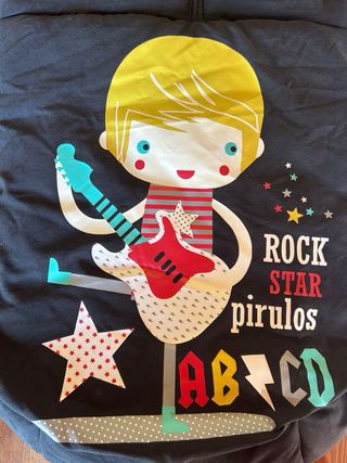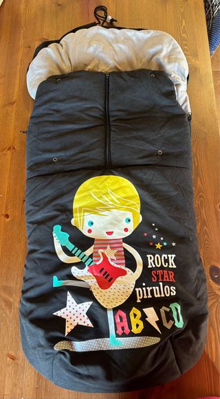Saco de invierno para carritos de bebé, negro, como nuevo. Muy poco uso. - 100cm x 45 cm - Estampado de Rock Star Pirulos con un niño tocando la guitarra. - Colores vivos y alegres. - Material exterior negro y forro interior gris. - Ajustable a todo tipo de carro / silla de paseo - Tiene cremalleras a ambos lados para facilitar su apertura para por ejemplo cambiarle el pañal al peque - La parte interior tiene una franja abajo para proteger en caso de que el peque lleve zapatos