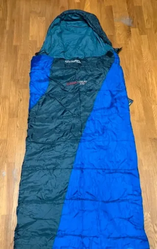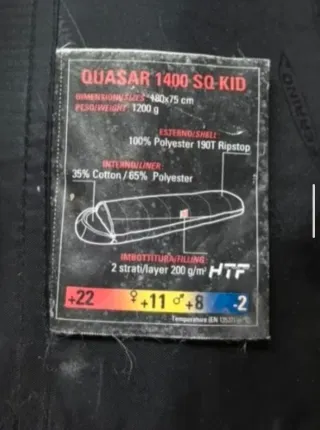 Saco de dormir Ferrino Quasar 1400 Sq para niños. Diseñado para ofrecer comodidad y abrigo. Peso 1200g Medidas: 180x 75 cm. Temperatura comfort 11.°C. Es ideal para excursiones campistas en primavera-verano o en albergues. Está en buenas condiciones. La etiqueta de la funda se ha borrado al lavarla ( menos mal que hice una foto antes). Tiene un pequeño pique como aparece en la foto. - Color azul y gris oscuro. - Modelo Quasar 1400 Sq. - Etiqueta KID indica que es para niños o para personas de baja estatura.
