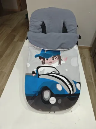 Saco para silla de paseo universal con un divertido diseño. Se adapta a cualquier silla de paseo, en la foto esta puesto en un bugaboo fox - Estampado de un niño conduciendo un coche azul. - Parte superior acolchada en gris. - Detalles de lunares grises. Tiene un forro interior que se puede quitar para cuando hace buen tiempo