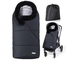 Saco de invierno de la marca Ergobaby, ideal para mantener al bebé abrigado. - Exterior impermeable negro - Interior forrado de borreguito gris. - Aberturas para el arnés del cochecito o silla de paseo -parte interior inferior no está forrado para facilitar la limpieza de la zona en cual están los pies del bebé/niño -parte inferior de atrás del saco tiene doble velcro para achicar la longitud del saco -doble cremallera (tanto arriba como abajo)