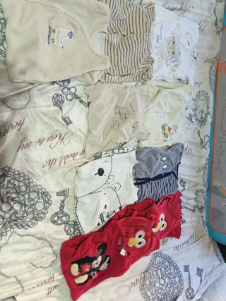 Lote de 10 pijamas para bebé de 9 a 12 meses. Incluye varias prendas con diseños divertidos. - Pijama beige con dibujo de oveja. - Pijama de rayas marrones y beige. - Pijama blanco con dibujo de ovejas. - Pijama beige con conejitos. - Pijama blanco con osos. - Pijama gris con rayas. - Pijama rojo con Mickey Mouse. - Pijama rojo con Elmo. Regalo 1 sacó de dormir talla 90cm