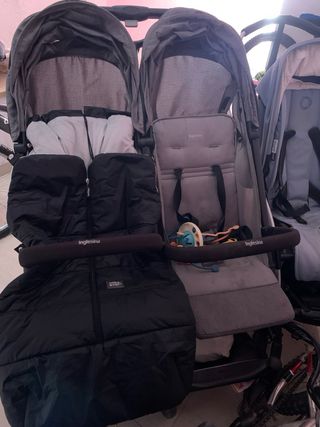 Carro gemelar de la marca Inglesina en color gris y negro. Perfecto para dos niños. - Diseño moderno y funcional. - Asientos cómodos y amplios. - Estructura resistente y duradera. Está muy bien conservado. ¡Regalo los dos sacos de invierno universales! Nuevo cuesta alrededor de 300€