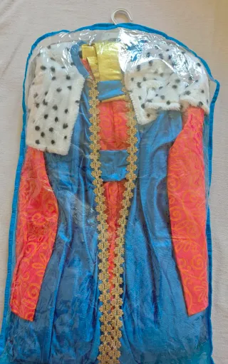 Disfraz de Rey Mago para niño, ideal para celebraciones. Talla 4. Para niño: Altura 1.45-1.60 Cadera. 81-87 Mas medidas en las fotos. Sin usar. Me equivoqué de talla. Sacado para la foto. Si necesitas más datos me dices - Incluye túnica, cinturón y capa - capa azul con detalles dorados, mangas rojasy capita blanca y negra - tunica roja estampada. Si necesi