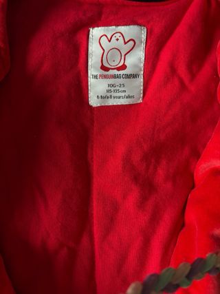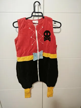 Saco de dormir para niños con diseño de pirata, ideal para mantenerlos abrigados y cómodos durante la noche. Marca The penguine bag company - Color rojo y negro. - Detalle de calavera y tibias cruzadas. - Cremallera frontal. - Puños y detalles amarillos. TOG 2'5 Talla 2/4 años 87-110 cms