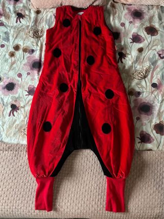 Saco de dormir con diseño de mariquita para niños. Es de color rojo con puntos negros y tiene cremallera frontal. - Material suave y cómodo. - Diseño divertido de mariquita. - Ideal para mantener a los niños abrigados.