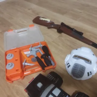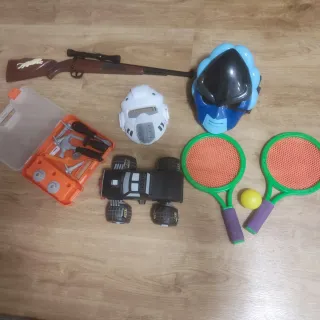 Lote 2 de juguetes para niño. 6 juguetes. - Rifle de juguete con mira y detalles de animal. - Máscara de superhéroe azul y negra, funciona a pilas. - Máscara blanca de robot. - Coche todoterreno negro, saca las zarpas en las ruedas. - Caja de herramientas de plástico naranja con herramientas ikea. - Palas de tenis verdes con pelota amarilla. Precio negociable.