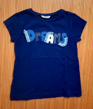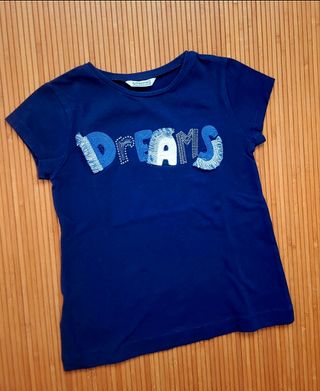 Camiseta de niña marca Mayoral. Manga corta. Talla 6/116cm tallaje real. Color azul marino. Estampado bordado y flecos con la palabra "Dreams". Está como nueva (la cámara saca efectos de color y luz que no existen realmente), está impecable, sin defectos y sin desgaste. Queda ideal con leggings o shorts blancos y vaqueros. ℹ️Precio no negociable. ℹ️ Descuento por lotes activo.