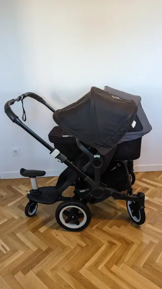 Ideal para tus gemelos/as o hermanos/as con poca diferencia de edad. Incluye: - chasis elegante 'all black' - ruedas sin cámara: ¡no más pinchazos! - dos capazos - 2 sillas en perfecto estado (usadas con colchoneta o saco) - 2 barras de silla, intactas y seguras - 2 capotas negras (no extensibles) - 2 capotas grises 'fresh' transpirables y extensibles - 2 sacos de invierno Bugaboo grises, perfectos para los días fríos - 2 burbujas para la lluvia - cesta lateral de almacenamiento con tapa - cesta inferior - patinete acoplado Bugaboo con asiento confort, ideal para tercer niño/a o como evolución de dos hermanos seguidos