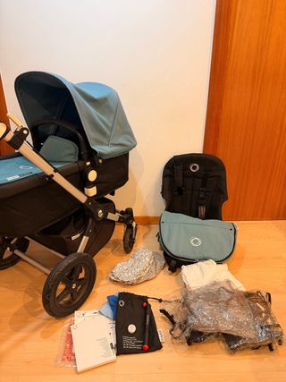 Carro Bugaboo B5 en color gris. Incluye capazo. - Capazo acolchado - Funda de capazo. - Silla reversible. - Saco de carro (No es de marca Bugaboo.) - Plástico lluvia. Está en buen estado, solo el mango un poco desgastado por el uso.