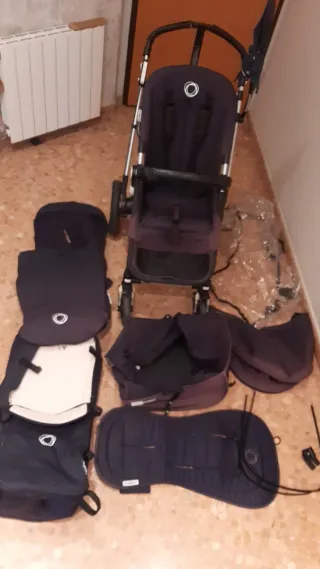 Carrito Bugaboo Bee 5 en color negro y beige. Incluye los siguientes accesorios. Se podría negociar vender cosas por separado si no te interesan todos los accesorios. - Silla de paseo negra (la estructura de la silla está casi sin usar, pues la otra se me rompió. También reemplacé el mecanismo de subir y bajar el manillar, que parece estropearse con el uso). La capota negra presenta desgaste. - Capazo negro, prácticamente nuevo. - Funda de asiento acolchada beige de verano. - Capota beige de verano - Plástico de lluvia. - Patinete con asiento en muy buenas condiciones - Saco de invierno gris en muy buenas condiciones - Bolso
