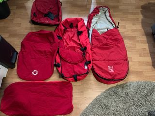 Conjunto de accesorios para cochecito Bugaboo en color rojo. - Saco de invierno acolchado. - Funda para silla. - Capota. - Pie de silla.