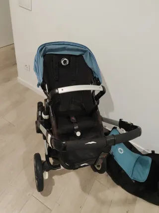 Bugaboo con capazo y silla negra. Accesorios bugaboo: 2 capotas negras de invierno, burbuja de lluvia, cesto, saco invierno bugaboo color rosa. Accesorios otras marcas: saco invierno animal print marine, colchoneta verano rayas azules y verdes, guantes invierno y protectores manillar.