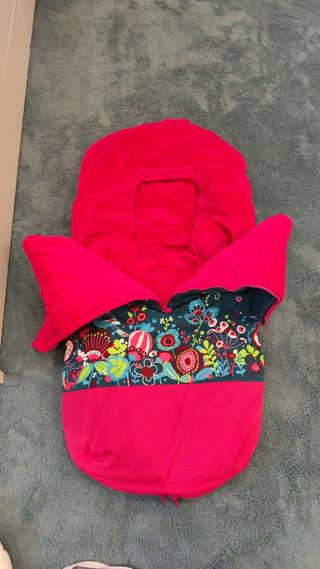 Saco para silla de bebé, ideal para abrigar a tu pequeño durante los paseos. Es de color rosa y gris, con un diseño de estampado romántico. - Perfecto para mantener al bebé calentito. - Diseño bonito y delicado. - Material suave y agradable al tacto. Otro en oscuro con pelito por dentro, más abrigado . Los dos 30 euros.