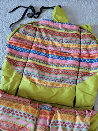 Saco para silla de paseo de bebé con un alegre diseño. La goma de atrás está dada de sí. Marca utzurre - Estampado étnico multicolor. - Forro interior de color verde lima. - Cremallera central para facilitar el acceso. - Cintas de sujeción negras.