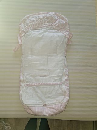 Saco de abrigo para silla de paseo de bebé, ideal para mantenerlo caliente. - Color rosa y blanco. - Material suave y confortable. - Diseño con detalle de lazo. De la marca pasito a pasito rosa y por dentro de borrego muy bien cuidado