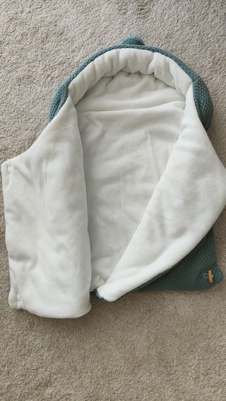 Saco de tricot para Capazo o Silla de paseo, en verde. Ideal para mantener a tu pequeño abrigado. Su diseño tejido le da un toque acogedor Características: Saco para Capazo / Silla. En tricot 100%, con forro de pelo ultrasuave. Se puede utilizar para el Capazo, o simplemente para llevar al bebé en los brazos. Material Tejido exterior: 100% algodón. Tejido interior: 100% poliéster. Relleno: 100% poliéster. Otras características Lavado: máximo 30º C, no usar lejía, no usar secadora, no planchar, no lavar en seco.