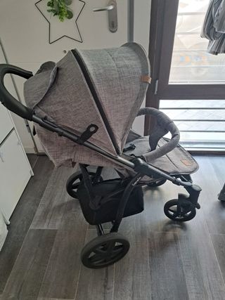 Silla de paseo para bebé en color beige y gris. Cómodo y buen estado con gran almacenamiento y de regalo saco de frío - Capota extensible. - Asiento acolchado. - Cesta de almacenamiento inferior. - Ruedas todoterreno.