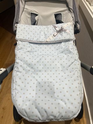 Saco para silla de paseo de bebé, con un diseño de topitos en azul claro y gris. Apenas usado, como nuevo - Diseño de topitos en azul y gris. - Acabado acolchado y transpirable - Detalle de lazo y cinta decorativa, entrelazos y pasamaneria con botones forrados a juego.