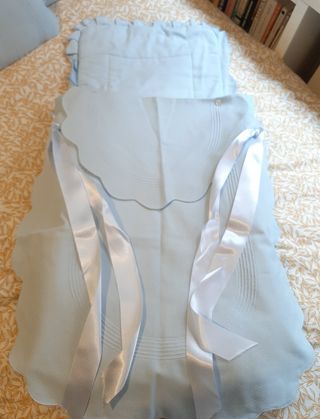 Saco de abrigo en color azul, para el cuco y para la silla. Diseño clásico, con lazos blancos, y algodón piqué azul claro. Recogida zona metro arturos Soria. Más artículos infantiles en mi perfil.